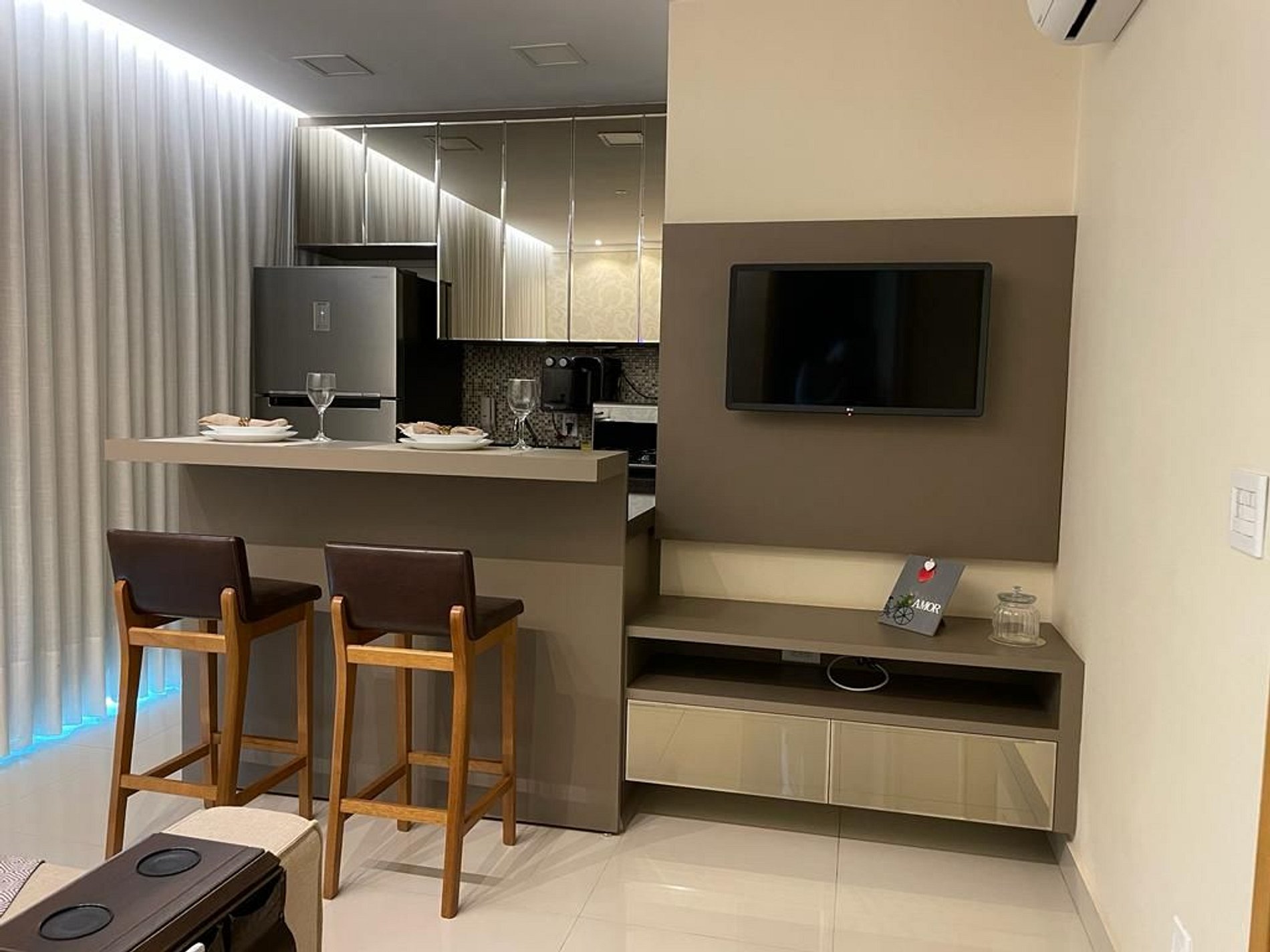 Você ficará hospedado em um dos apartamentos de 01 quarto no Easy Life. Cada apartamento possui 44m, com uma suíte privativa, com vista para o Parque, sala, mesa de jantar, cozinha completa e máquina de lavar, internet, TV Smart com Netflix.